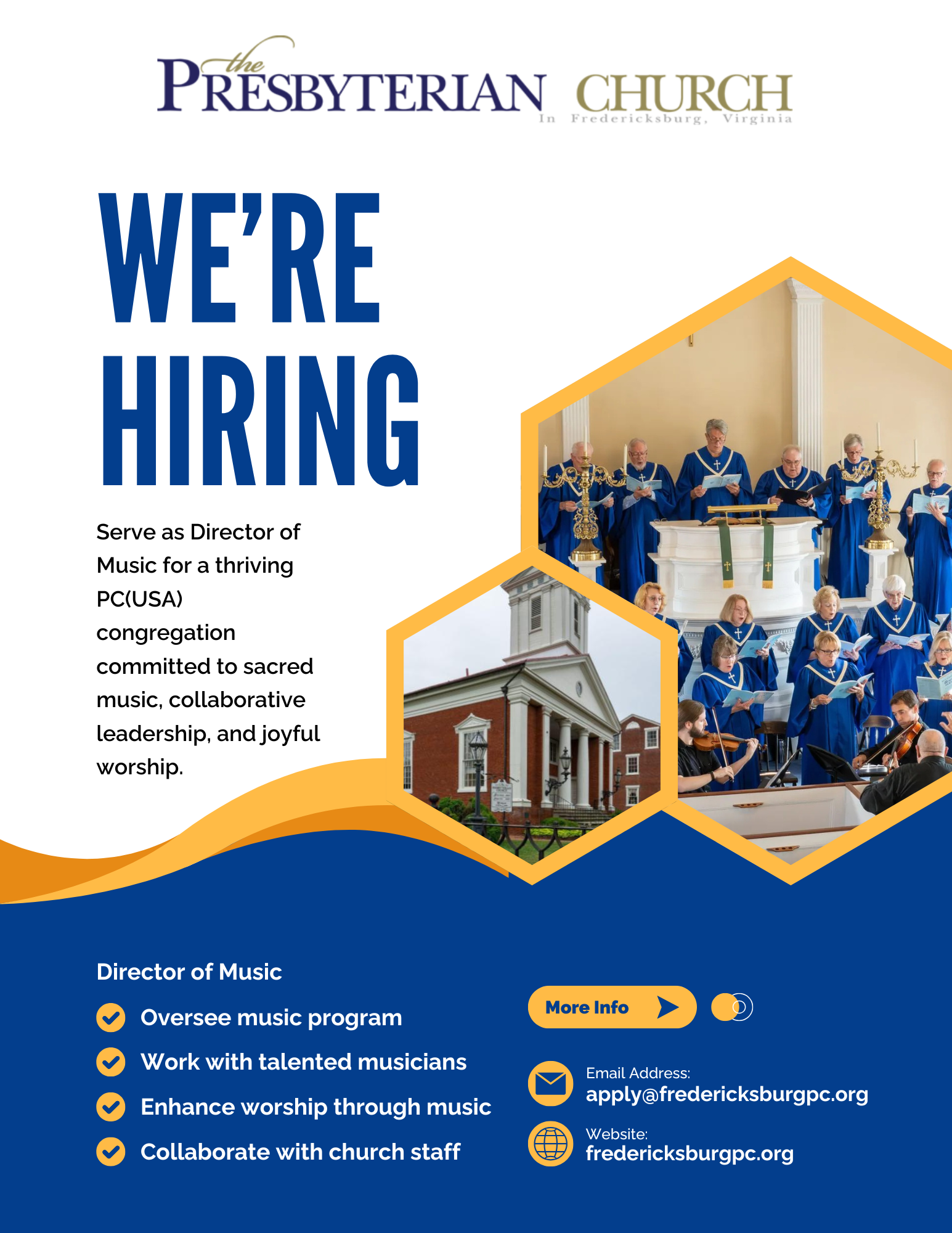 The Presbyterian Church in downtown Fredericksburg seeks a part‑time Director of Music to lead and nurture a vibrant, intergenerational music ministry rooted in the classical and sacred traditions of Reformed worship. Building on a long history of musical excellence, the Director of Music will collaborate with our pastor, organist, staff, and volunteers to shape worship that reflects the depth, beauty, and theological integrity of our tradition. This position offers the opportunity to guide established ensembles, cultivate musical growth across all ages, and steward a rich legacy of choral and instrumental music within a historic downtown congregation.