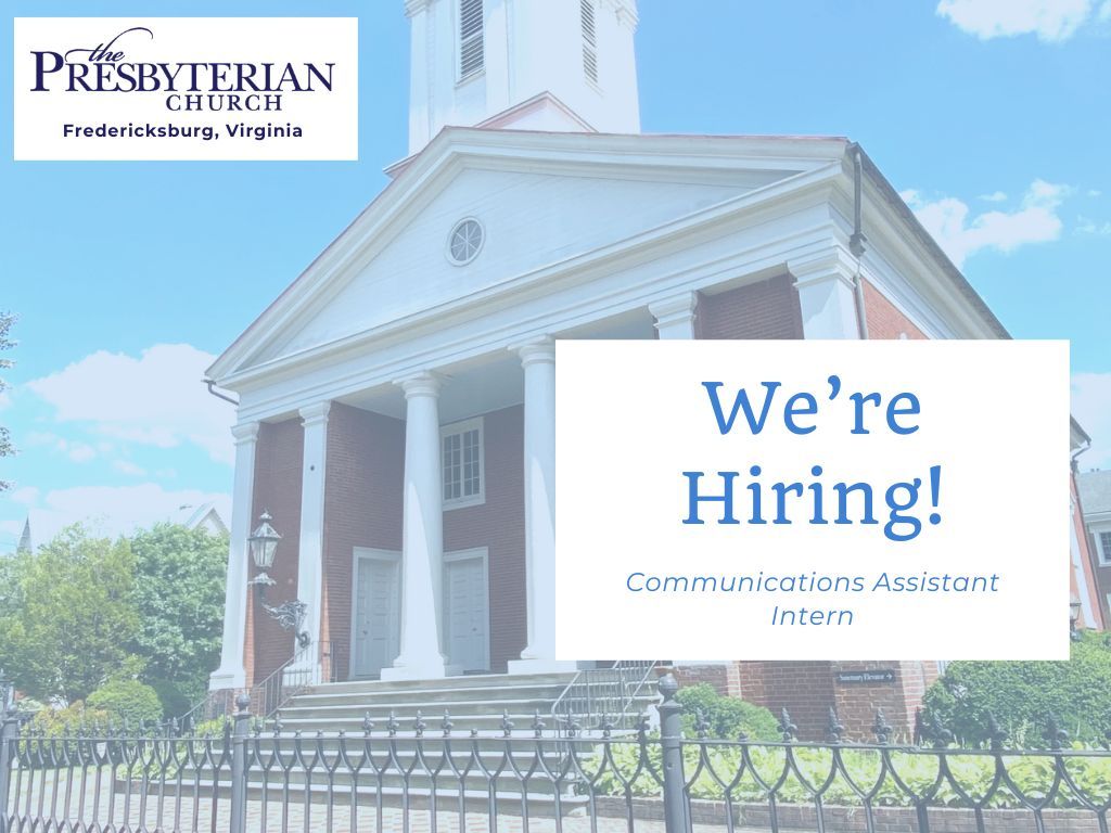 The Presbyterian Church in downtown Fredericksburg seeks a Communications Assistant Intern for content creation, website management, and support for printed and digital communications, averaging 10 hours of mostly remote work per week beginning immediately. For more information, click on Job Description below or contact apply@fredericksburgpc.org.